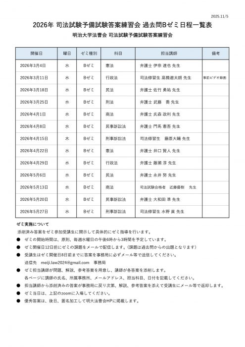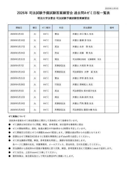 尚、平成29年11月から開始されました明治大学法曹会主催、明治大学及び 法制研究所協賛司法試験予備試験答案練習会(会費すべて無料)は本資金により運営されております。詳細は、明治大学法曹会HPお知らせ等参照。