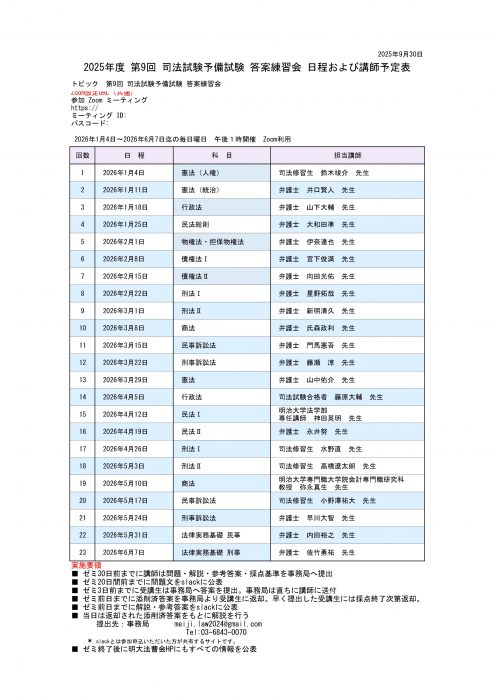 司法試験を受けようとする者が法科大学院修了生と同等の学識及びその応用能力並びに法律に関する実務の基礎的素養を有するかどうかを判定するための試験であり、合格者には司法試験の受験資格が与えられます。明治大学法曹会では、本年度も『第9回予備試験答案練習会』の募集を開始いたします。ガイダンスはズーム方式で行います。申込みは下記記載の明大法曹会HPの答練事務局受付から行ってください。法曹教育の理念に基づき過去8年間の予備試験答練、各ゼミの問題解説、参考答案、優秀答案は法曹会HPで全て全国の受験生に公開、保存されています。本答練の最大の特徴は、問題の作成、解説、答案添削指導から答練後の講評までの全てのプロセスを、第一線で活躍する法律家(予備試験合格者及び同等以上の実力者で編成)で構成される明治大学法曹会のプロジェクトチームが行うことにあります。判例、学説、論点丸暗記ではなく「考える勉強法」を具体的に指導し、明治大学専任講師神田英明先生、明治大学専門職大学院 弥永真生教授のご出題、解説、個別ゼミ、プレゼミ、論文直前ゼミ、がございます。合格率は4%。司法試験より難しい予備試験突破のため年間を通じて厳しく指導します。