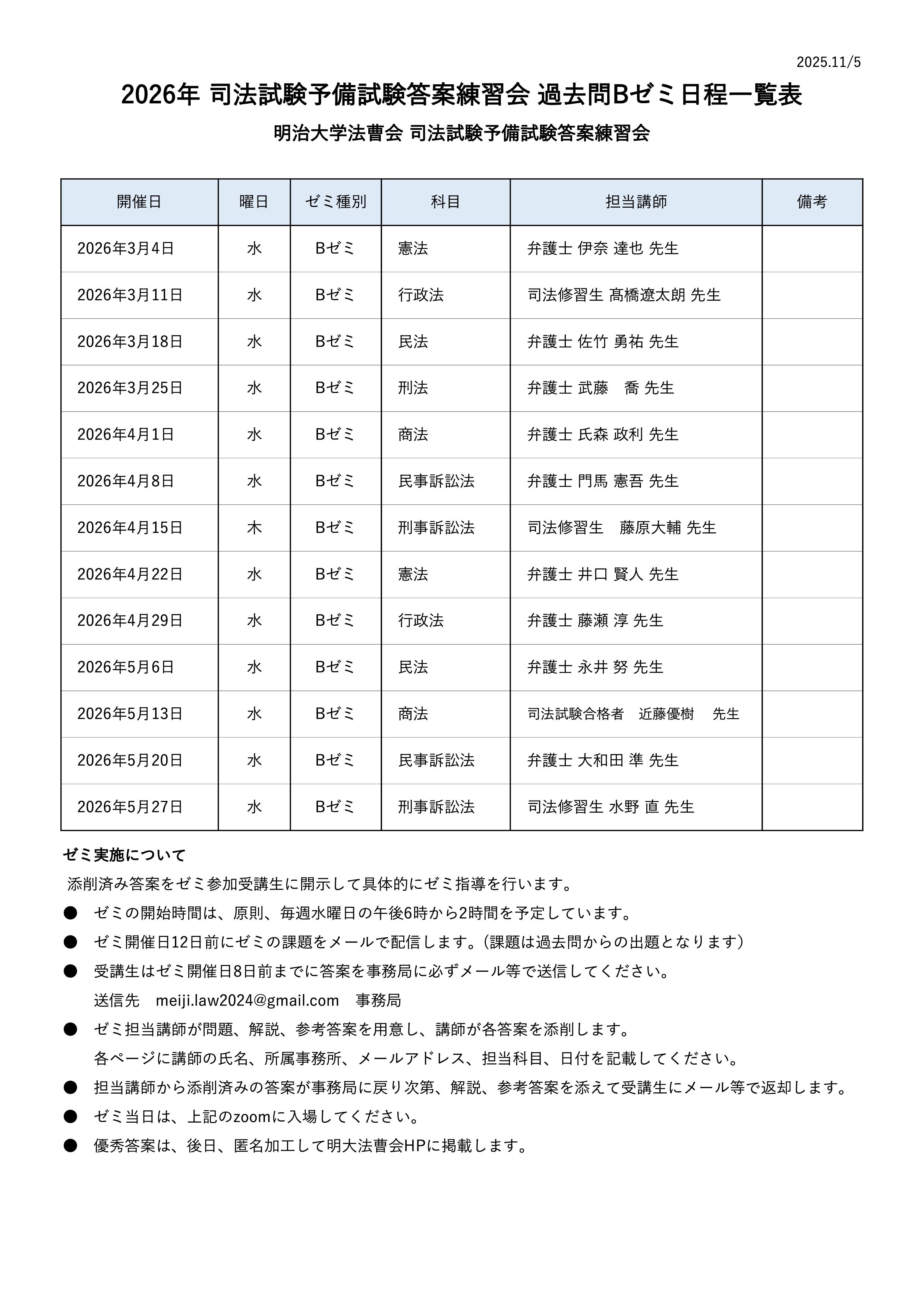 全て無料(全国の明大法曹会会員の寄付金である明治大学法曹会資金で運営)